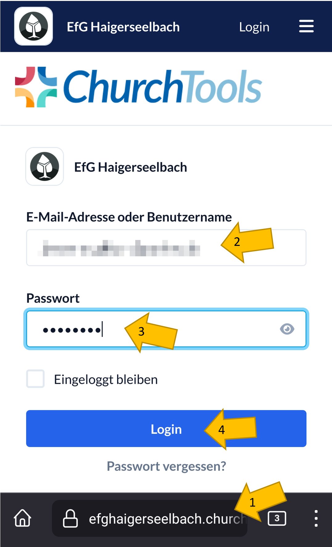 https://efghaigerseelbach.church.tools. Gib deine E-Mailadresse ein, die du in ChurchTools hinterlegt hast.