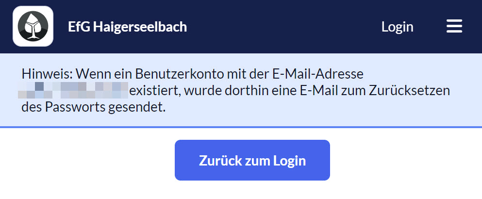 Du erhältst einen Hinweis, dass eine E-Mail zum Zurücksetzen des Passworts an die von dir angegebene E-Mailadresse verschickt wurde.