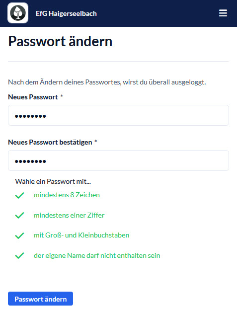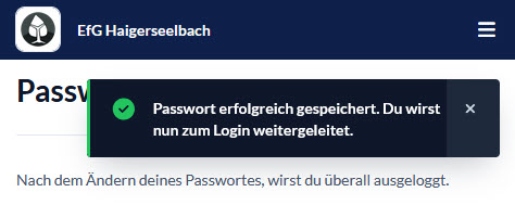 Du erhältst eine Erfolgsmeldung. Anschließend wirst du zur Anmeldseite weitergeleitet. Nun kannst du dich mit deinem neuen Passwort anmelden.