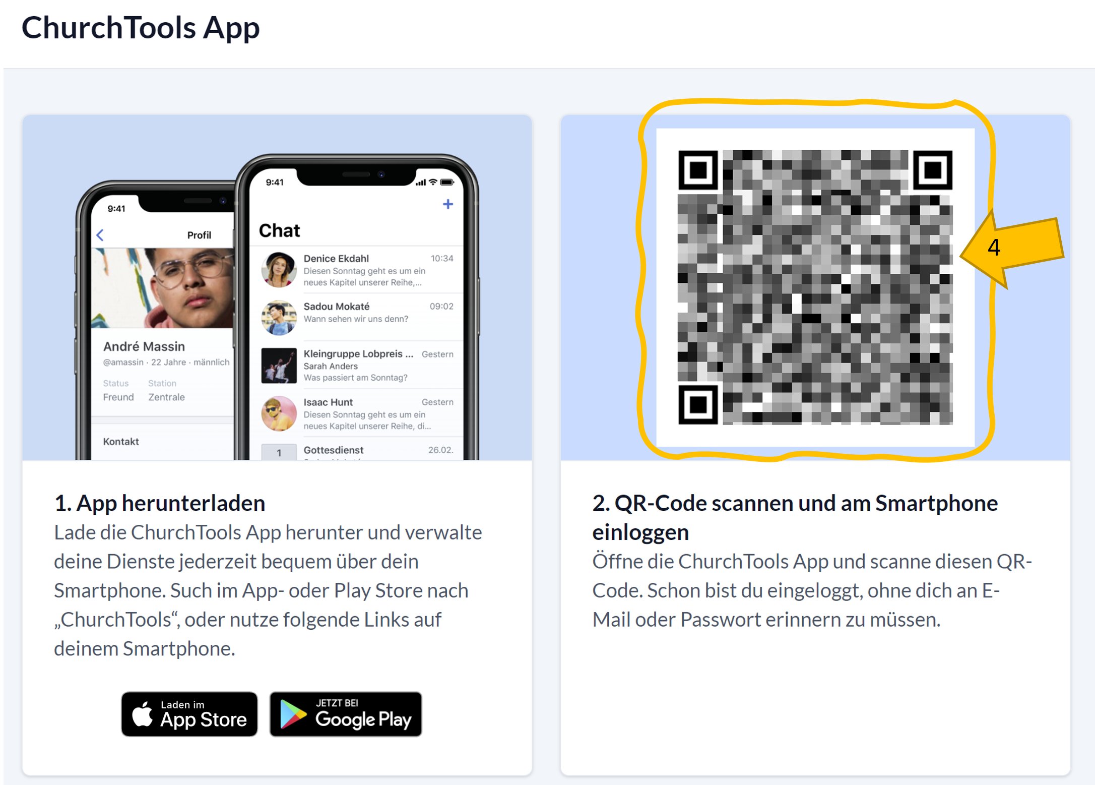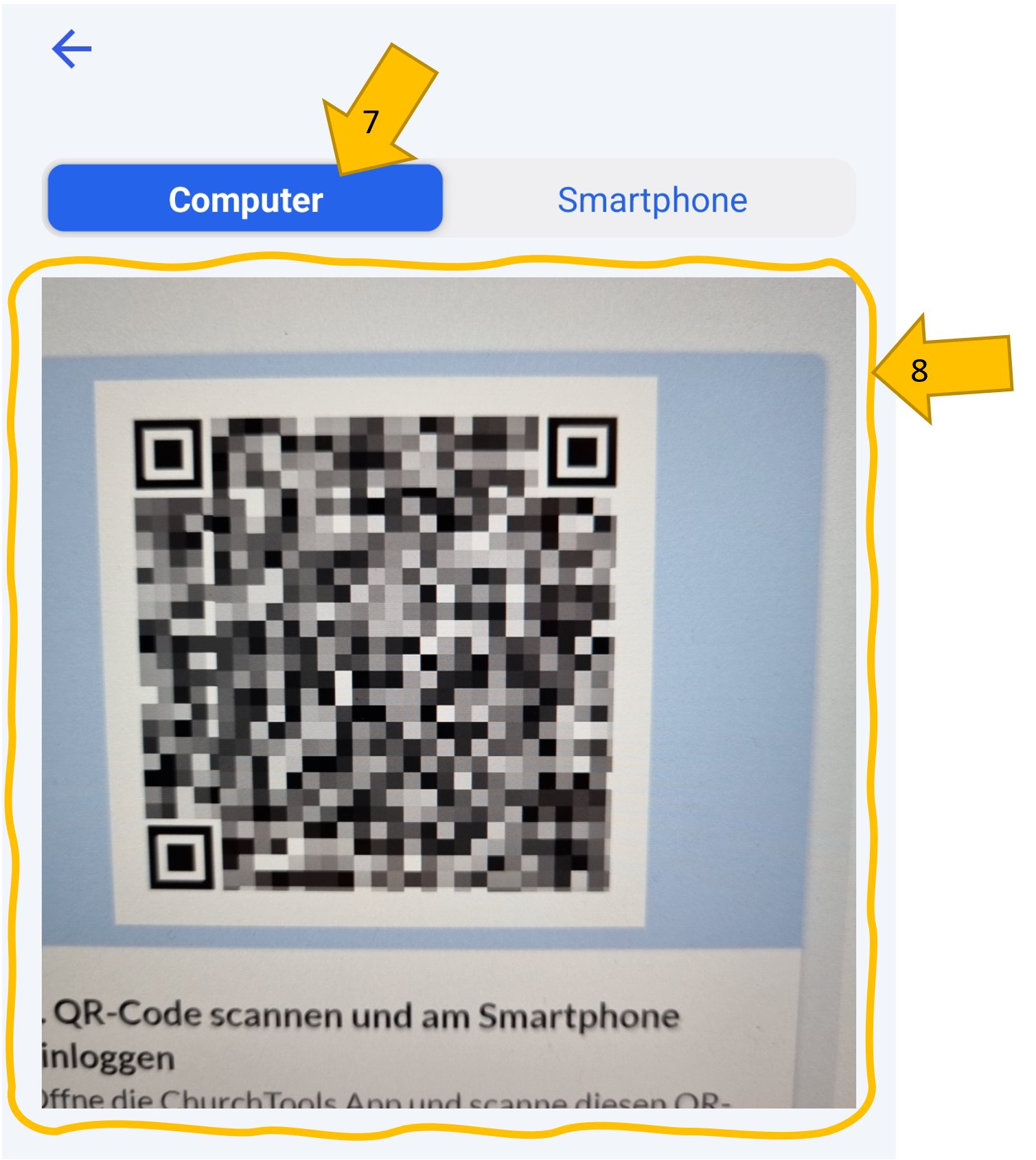 In 8 Schritten kannst du die Anmeldung in der ChurchTools-App mittels QR-Code und einem PC durchführen. Du benötigst also dein Smartphone und einen PC.