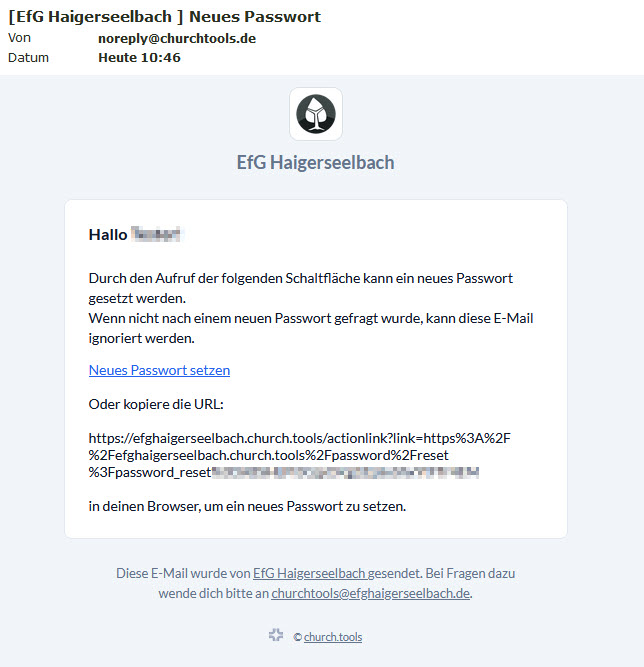 Du wirst mit korrektem Namen angesprochen. Die in der E-Mail enthaltenen Links verweisen auf https://efghaigerseelbach.church.tools/....